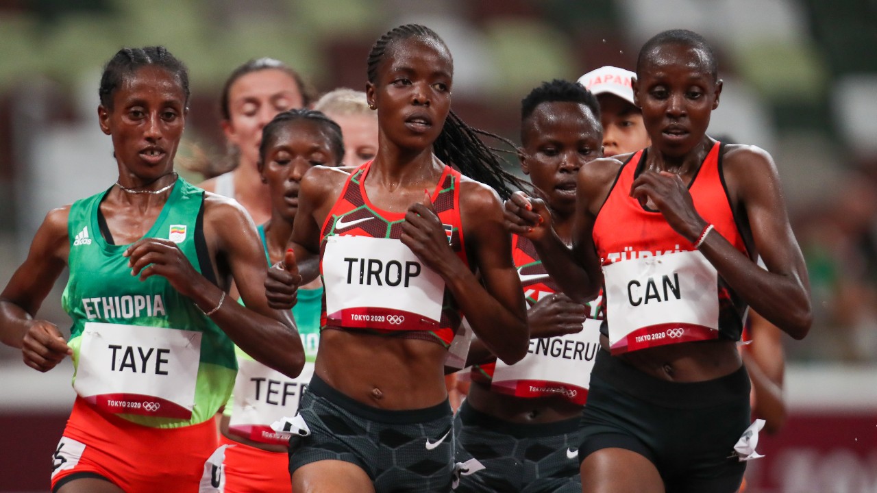 2 2021 file photo Kenyas Hellen Obiri center and Agnes Tirop right compete in the womens 5000-meters final at the 2020 Summer Olympics in Tokyo.