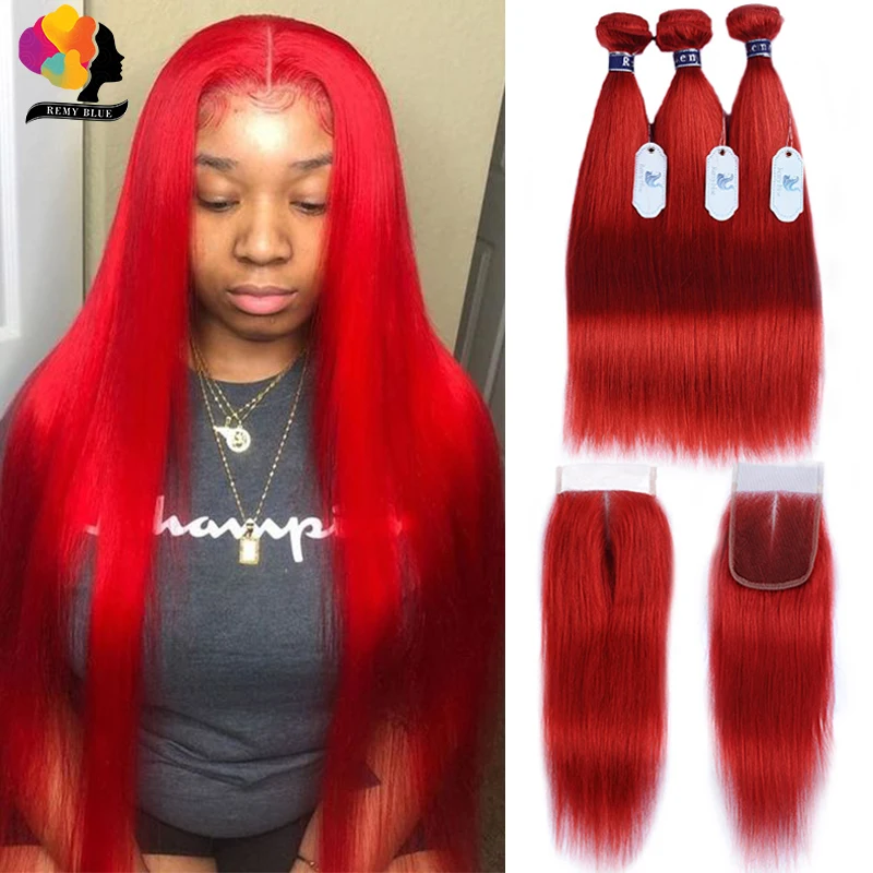 99j Burgundy Straight 3 Bundles With Closure Red Colored Brazilian Straight Human Hair Lace Closure With Bundles Remy Hair Weave