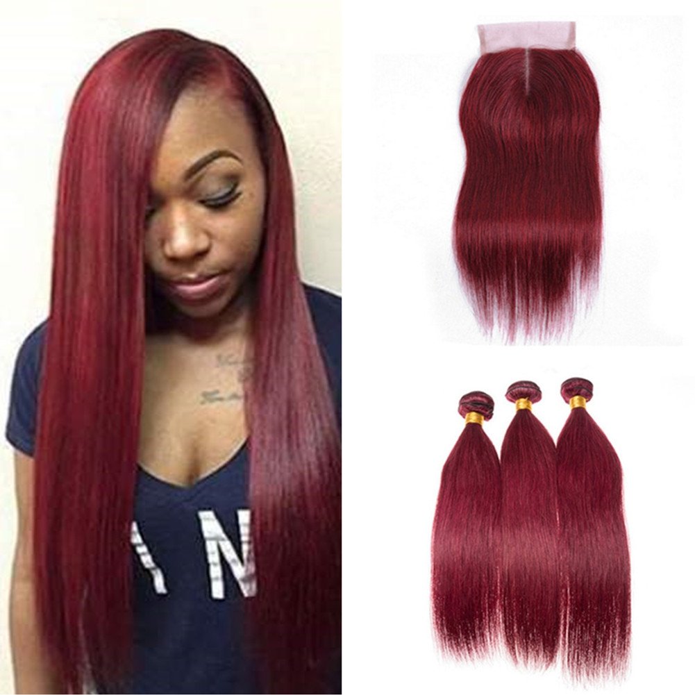 Amazon Com Ruma Hair New Bright 99j Burgundy Straight Virgin Hair Weaves With 4x4 Lace Closure 4pcs Lot Wine Red Peruvian Human Hair 3 Bundles With Middle Part Top Closure Piece 14